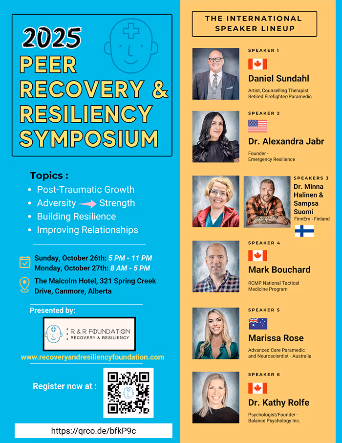 Join first responders, healthcare professionals, and trauma survivors in the Canadian Rockies for a powerful weekend of healing and growth at the Peer Recovery and Resiliency Symposium, hosted by The Recovery and Resiliency Foundation. Held October 26–27 at the Malcolm Hotel in Canmore, Alberta, this two-day event will explore post-traumatic growth, emotional regulation, and peer support through keynote speakers from Finland, the U.S., and Canada. Attendees will gain tools for resilience, connect with others, and access resources tailored to trauma-affected individuals.